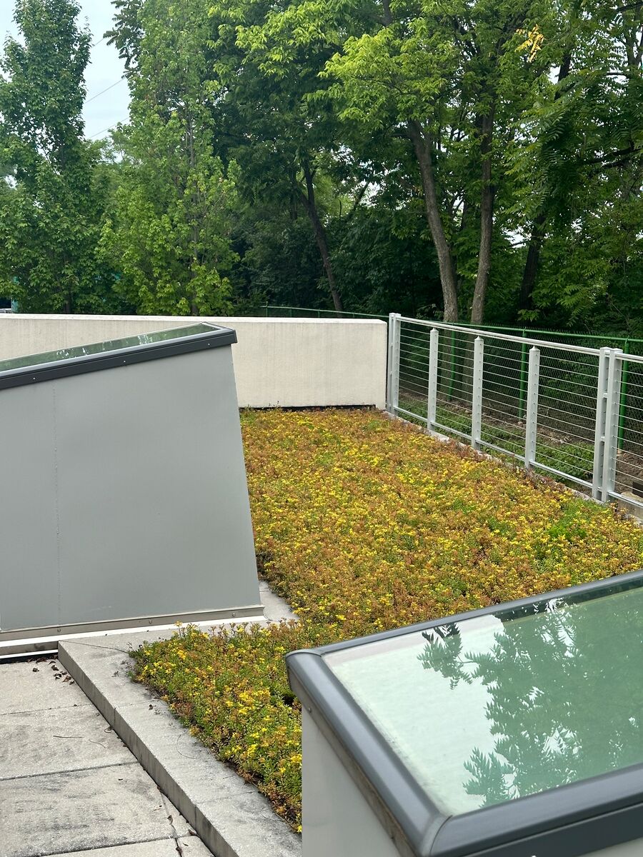 "The roof was designed to use rainwater runoff to provide hydration for the plants. It incorporates drip irrigation to conserve water while filtering it before it drains into the surrounding environment. Drought and heat-tolerant sedum plants grow on the roof and attract local pollinators such as butterflies, bees and hummingbirds."